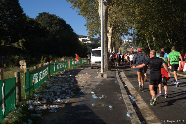 Malgré la présence de nombreuses aires de déchets très visibles situés après les stands de ravitaillements (d'ailleurs sur la photo, on devine le coureur en noir jetant sa bouteille que l'on aperçoit répandant son précieux liquide dans les airs), de nombreux coureurs jetaient malgré tout leur bouteille par terre !!