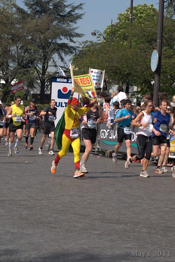 Nous sommes positionnés bien après la piste de départ, le speaker précisait que les coureurs en fauteuil devaient se placer devant les autres coureurs, mais ne voulant pas être pris dans la cohue du départ, nous sommes restés bien en arrière.